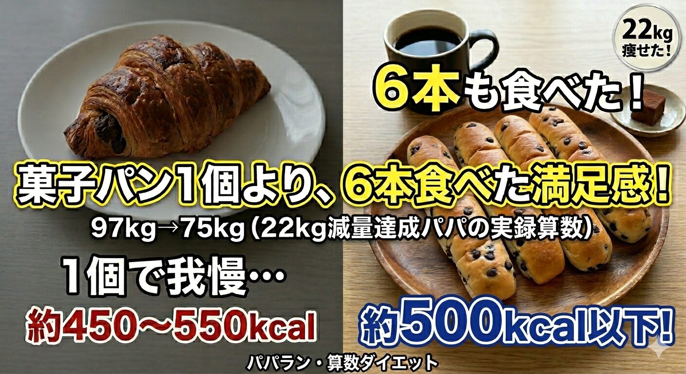 実は、大きな菓子パンを1個食べるのも、スティックパンを6本食べるのも、カロリー(算数ダイエット的に)で見れば大差ないことが多いんです。